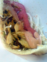 ハロショをでて向かった先は先日のハロモニ@で娘。が訪れた『モーゼスさんのケバブ』 ギャグのつもりで言ったのかどうか分かりませんが、ぴ~すさんが『道重ソース』と注文したところ店員は何のためらいも無く「超辛いよ~~~!」と言って作り出したではありませんかww 看板には載ってない裏メニューとして存在するみたいですね!いやいやこれにはびっくり!(あの放送以降に頼んだ人がかなりいると予想されます。) なので自分も調子に乗って『亀井スペシャル』をオーダーしたところまたもや店員が「超辛いよ~~~!」…って本当にあるのかよww この適当さこそが亀井スペシャルなんだな…きっと。 中身はもやはり適当なのか、4種類の辛ソースをすべてMIXする始末ww そして出来上がったのがこれ↓